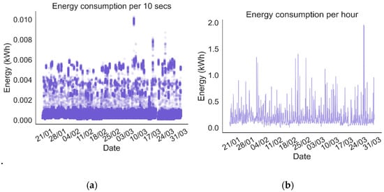 (a) Energy consumption per 10 s; (b) Average energy consumption per hour.