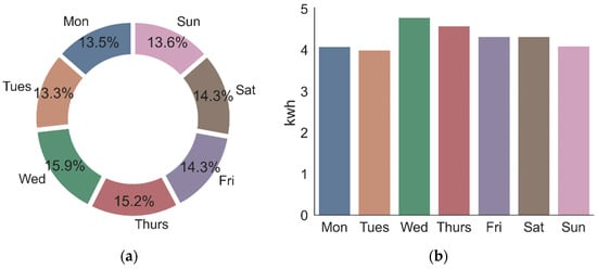 Average weekly energy distribution by days of week. (a) Percentage-wise; (b) Consumption-wise.