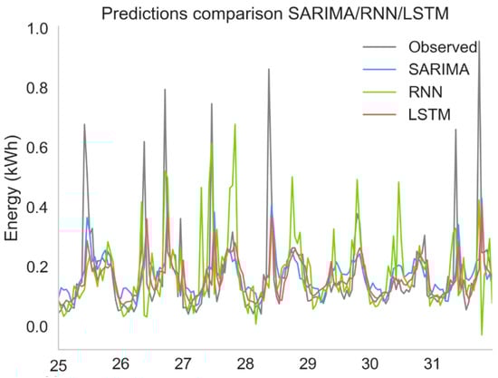Prediction comparison of 3 different forecasting algorithms—SARIMA, RNN and LSTM.
