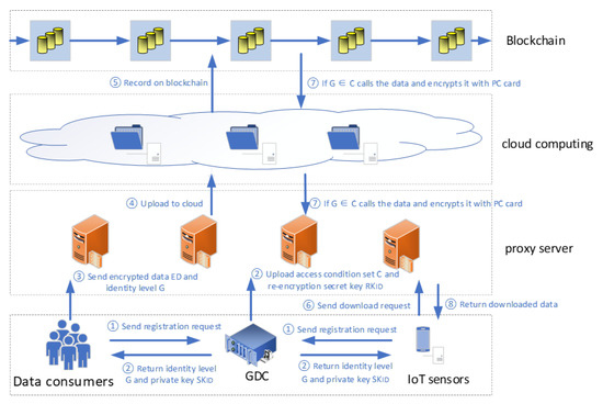- Chen, Y.; Hu, B.; Yu, H.; Duan, Z.; Huang, J. A Threshold Proxy Re-Encryption Scheme for Secure IoT Data Sharing Based on Blockchain. Electronics 2021, 10, 2359. [Google Scholar] [CrossRef]