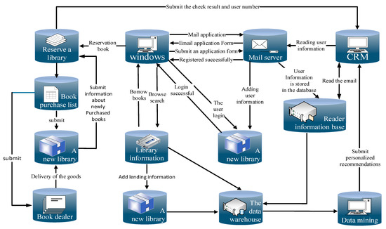 The business model of the library system has 23 business links. Users only need to browse books online at anytime and anywhere [16]. These 23 business links are mail application, mail form, application form, successful registration of client system, adding user name password, user information library, user login, successful login, book browsing, book borrowing, history information database, storage of books, adding to shopping list, submitting, adding new book information to new shopping library, submitting new book information, extracting related information, submitting recently purchased book information, submit sample results and user names, read user names and e-mail addresses, store user data, assign information to mail servers, and send various subscription information to mail readers. The library business process is shown in Figure 5.