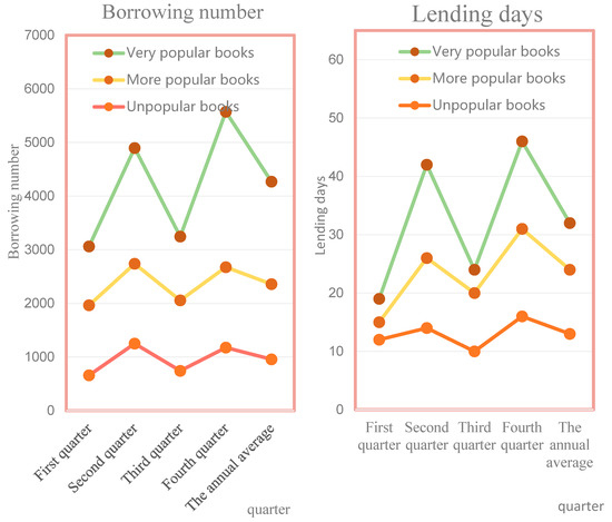From the data, the average number of books borrowed per year is between 0 and 6000, indicating that the usage of different types of books varies greatly. The data in the second and fourth quarters are significantly higher than those in the first and third quarters, which may be caused by final exams in the second and fourth quarters. For borrowing days, books returned within 1–3 days do not meet the reader’s true borrowing needs, so the length of borrowing should be set to 4–60 days. For popular books, the number of days of borrowing is much greater than the number for unpopular books, indicating that the popular book type is more in line with the needs of the reader. The analysis of the above results shows the readers’ interest and preference for books. Among them, the number of books in the most popular categories is very large, which can increase the number of such books, timely supplement the purchase, and check the integrity of the books to ensure that the readers can borrow them when they need them. In addition, in terms of book placement, one might consider placing such books in a prominent place in the library for readers to borrow. This increases the rationality of book purchase and allocation of book purchase funds, and does not cause blindness in book purchases.