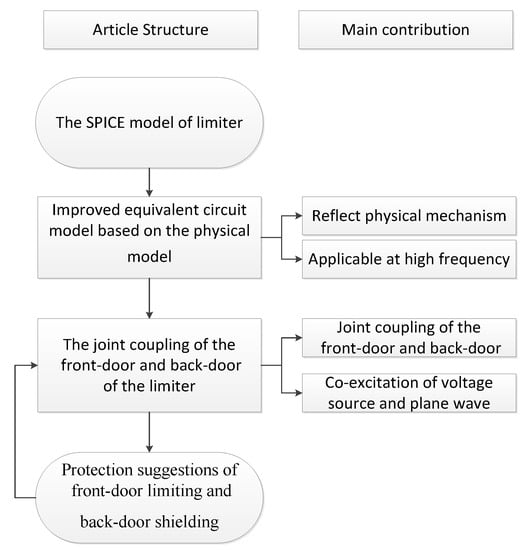 The structure and main contribution of this paper are as follows. Section 2 introduces the SPICE model of the limiter and the improved equivalent circuit model based on the physical model. In Section 3, based on the improved equivalent circuit model, the joint-coupling characteristics of the front door and back door of the limiter are analyzed, and the protection suggestions of front-door limiting and back-door shielding are given. Section 4 is a summary. A flow chart illustrates the structure and main contributions of this paper in Figure 1.