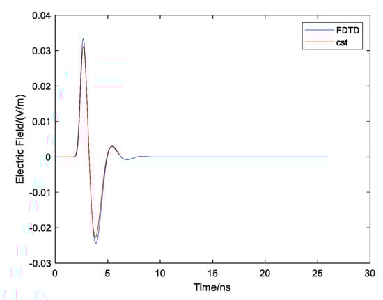 For testing the accuracy of the electromagnetic characteristics of the target under the plane wave irradiation, the plane wave is used to irradiate the dielectric sphere, the waveform of which is the Gaussian pulse. The propagation direction is the z direction, and the electric field direction is the x direction. The radius of the dielectric sphere is 10 cm, and the electromagnetic parameters are epsilon_r = 3, sigma_ e = 0.5 S/m, sigma_ m = 0.5 H/m, and mu_r = 2. The spatial step size is dx = dy = dz = 1 cm. We select the center position of the medium sphere as the reference point and obtain the comparison result with CST, as shown in Figure 9.