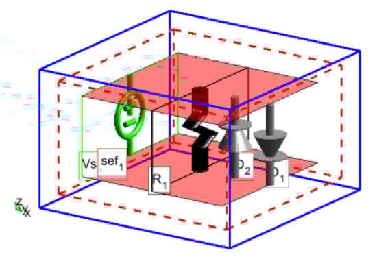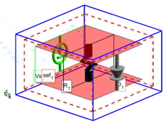 The voltage of the front-door coupling is mainly a low-frequency component, assuming that the frequency of the sine wave voltage is 400 MHz and the amplitude is 4 V. The amplitude of the Gaussian pulse of the back-door coupling is 1000 V/m, the propagation direction is along the z direction, and the electric field direction is the x direction. The mesh step is dx = dy = dz = 2 mm, and the model is shown in Figure 10. Setting the circuit size to 20 mm × 20 mm × 10 mm, we can observe the voltage at both ends of the diode and the field at the center.