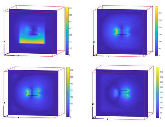 In Figure 13, the influence of the applied Gaussian pulse on the voltage at both ends of the diode can be clearly seen, which makes the voltage–response curve different from that of front-door coupling only in Figure 7. We can see that a pulse whose absolute amplitude takes over 5 V has been introduced. This can be explained as above. The dynamic changes of the electric field in the circuit are shown in the Figure 14 below.