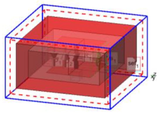 In order to reduce the influence of the back-door coupling on the performance of the limiter, the limiter is placed in a PEC metal shielding cavity. The size of the shielding cavity is 40 mm × 40 mm × 20 mm, and the wall thickness is 4 mm. In reality, it is difficult to achieve complete shielding, so a 4 mm × 4 mm × 4 mm hole is opened at the bottom of the shielding cavity to simulate this situation. The model is shown in Figure 20.