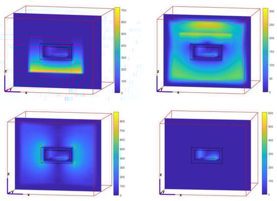 Compared with Figure 18, it can be seen that due to the skin effect of the shielding cavity and the reflection of electromagnetic waves, the back-door coupling component has been suppressed and eliminated, which proves the effectiveness of the shielding cavity. The dynamic changes of the electric field in the circuit are shown in the Figure 24 below.