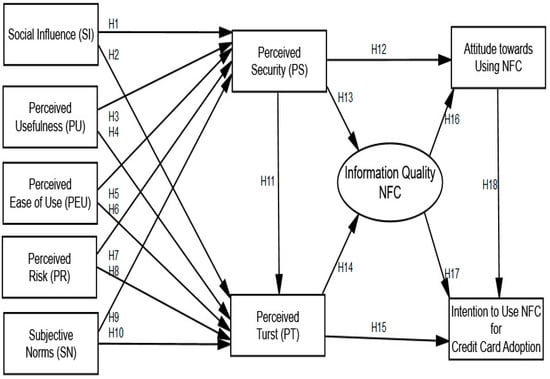 A customer’s belief that influential people perceive that they can or cannot engage in a given activity is referred to as social influence [101]. Consumers must examine their credit card details carefully, and they grow irate when their friends and coworkers frequently discuss them [102]. Amin claims that customers frequently internalize and mimic the economic attitudes of their relatives [103]. Furthermore, readily available media have helped to raise consumers’ knowledge of credit cards [104]. An empirical study found that a person’s propensity to use credit cards is influenced by the judgments of their social groups [105]. According to [106], the social effect solely affects the planned use of credit cards due to their perceived utility and simplicity of use. A person’s decision to use a mobile credit card will be positively influenced by social influence, a psychology science concept, according to [107]. Social impact is expected to favorably influence a consumer’s willingness to adopt NFC due to its popularity.