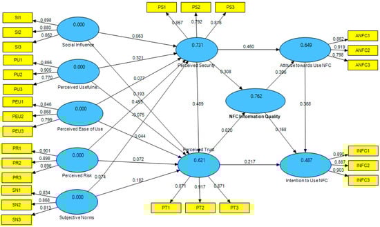 Mobile payments are still in their infancy in Saudi Arabia. Given that the mobile payment system requires the establishment of agreements among multiple players, this is understandable. Banks, technology companies, credit card companies, phone companies, startups, governments, businesses, customers, and other stakeholders must all work together to create a common interest and synergy. NFC might provide merchants with a means to interact with their consumers directly through products, applications, or mobile payments. When a customer inspects an NFC chip in a package, for example, the customer could send real-time data to the manufacturer, attempting to generate extremely valuable data, because the technology allows manufacturers to track both what happens to their products after they leave the shelves and their customers’ purchasing habits [155]. For these reasons, we chose to investigate this technology. NFC technology has become one of the most exciting technologies in recent years due to the economic potential in its usage for mobile phones and the reliance on important features in the immediate term beyond mobile payment [155]. M-commerce (mobile commerce) apps and new business models, such as mobile payments, are now flourishing [155]. On the market, there are a variety of solutions that use diverse approaches and technologies. They all utilize near-field communication (NFC), which is also known as contactless payment. As a result of this study’s goal of building a new model for accepting mobile payment and NFC information quality, people in Saudi Arabia must find them compatible with their systems and show acceptance toward their usage and behavioral intention to use NFC mobile payment methods. The study’s conclusions have a large impact on the acceptance of NFC mobile payments [156]. This is one of the first studies to look at the factors influencing the consumer adoption of mobile payment services and the quality of NFC data. Based on theoretical considerations, we created a study model that outlines key components of behavioral control and attitudes toward usage for NFC mobile payment methods. Based on data from a comprehensive survey carried out in Saudi Arabia, Figure 1 provides empirical support for the proposed model. The most significant factors affecting the perceived safety of the adoption of mobile payments with NFC, according to Figure 2 and Figure 3 and Table 4, are social influence, perceived usefulness, and perceived simplicity of use, risk involved, and subjective norms. The factors that had the greatest impact on people’s perceptions of trust in NFC mobile payments were similar to those in earlier studies: social influence, perceived usefulness, perceived danger, and subjective standards [156]. Although it indicates that perceived ease of use has a negative influence on perceived trust in mobile payments utilizing NFC, this study varies from past research in that it finds that perceived ease of use has a positive impact on this perception [156]. Therefore, emphasizing the simplicity of NFC mobile payment is insufficient for the company’s success; smartphone users must instead be made aware of its advantages. The ease of NFC payment, such as non-swiping cards and automated transactions utilizing short-range wireless technology, appears to be the major focus of NFC providers’ marketing tactics in Saudi Arabia. According to the findings of this study, perceived ease of use without a strong sense of usefulness may be insufficient to drive smartphone users to employ NFC payment and its information quality capabilities. Perceived security also has the greatest impact on perceived trust, NFC information quality, attitudes toward using NFC, and the desire to use NFC for mobile payment. Similarly, perceived trust influences the quality of NFC information, attitudes toward adopting NFC, and willingness to utilize mobile payments with NFC. Finally, opinions toward NFC and the desire to utilize mobile payments with NFC are largely influenced by the quality of NFC information available. People must find mobile payment services and the NFC information quality to be consistent with their existing attitudes toward using NFC and their behavioral desire to use NFC mobile payment methods in order to contemplate adopting them. Acceptance researchers often disregard perceived security, perceived trust, and the caliber of NFC data because these are not addressed in the original TAM. We found that the elements that have the strongest effects on perceived security also have a strong positive and direct impact on perceived trust, the caliber of the NFC information, and attitudes toward adopting NFC in the context of future NFC payment usage. According to the R-squared (R2 = 73%), perceived trust has a significant positive and direct impact on NFC information quality and the desire to use mobile payment methods. The NFC protocol was accepted. NFC information quality has a substantial favorable and direct influence on attitudes toward adopting NFC and intention to use mobile payment methods, according to the R-squared (R2 = 62%). The NFC protocol was accepted. NFC information quality has a substantial favorable and direct influence on attitudes toward adopting NFC and intention to use mobile payment methods, according to the R-squared (R2 = 76%). A person’s attitude regarding the use of NFC has a major impact on whether or not they wish to use mobile payment methods. NFC was authorized by the R-squared (R2 = 66%), and the willingness to utilize mobile payment adaption NFC was accepted by the R-squared (R2 = 49%). This research will serve as a foundation for future empirical and conceptual research on mobile payment and NFC data quality. The results presented in this study offer additional research starting points, in addition to its overall contribution of attempting to identify, conceptualize, and operationalize pertinent acceptance drivers of mobile payments. They also offer 