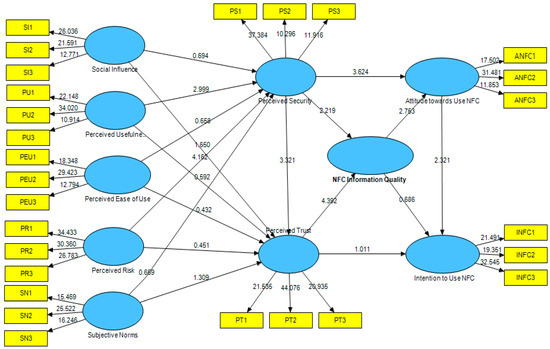 Table 6’s findings show that seventeen hypotheses were confirmed, while one was rejected. The research model analyzes ten main factors and 30 research items. The first factor was the relationship between social influence and perceived security (0.063), and social influence and perceived trust (0.193); thus, both hypotheses were accepted. Due to the correlation between usefulness and trust (0.321) and perceived value and perceived security (0.321), both hypotheses were accepted (0.075). For the third component, the correlation between perceived ease of use and security was accepted (0.077), but the correlation between perceived ease of use and usefulness trust (0.044) was disregarded. Due to the fourth factor, which was the association among risk and perceived safety (0.453) and evaluated risk and brand trust (0.453), both hypotheses were confirmed (0.072). Both hypotheses were accepted because of the association between subjective norms and experienced security (0.074) and trust (0.182) in the fifth factor. The sixth factor was the relationship between perceived security and perceived trust (0.489), and perceived security and NFC information quality (0.308), as well as perceived security and attitude towards use NFC (0.460); the three hypotheses were accepted. The seventh factor was the relationship between perceived trust and intention to use NFC (0.217), and perceived trust and NFC information quality (0.620); thus, both hypotheses were accepted. The eighth factor was the relationship between NFC information quality and attitude towards use NFC (0.396), and NFC information quality and intention to use NFC (0.168); thus, both hypotheses were accepted. Finally, the relationship between attitude towards using NFC and intention to use NFC (0.368) was accepted.