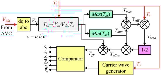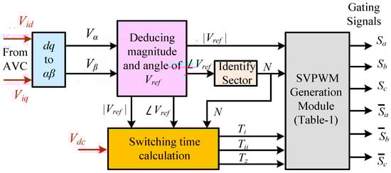 The SVPWM technique is one of the best methods for operating the three-phase voltage source inverter (VSI) to be used in renewable energy conversion systems and AC motor drive systems [32]. The conventional way of implementing the SVPWM, either in simulation or in the experiment, is shown in Figure 3. The reference input voltages Vid and Viq are obtained from the AVC and are processed to generate the reference voltage vector. The magnitude and angle are deduced using (21).