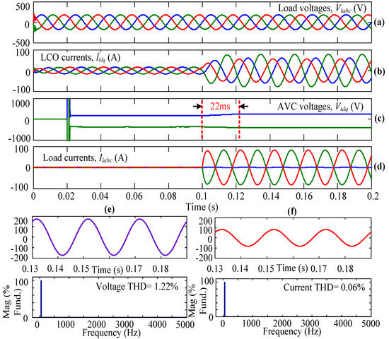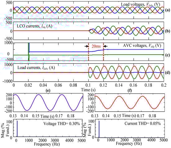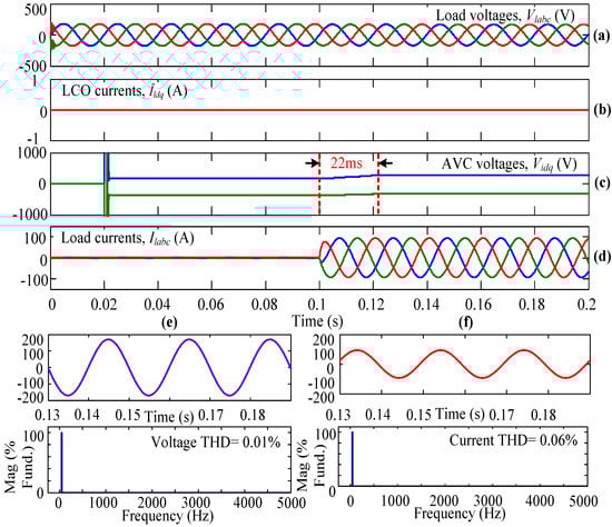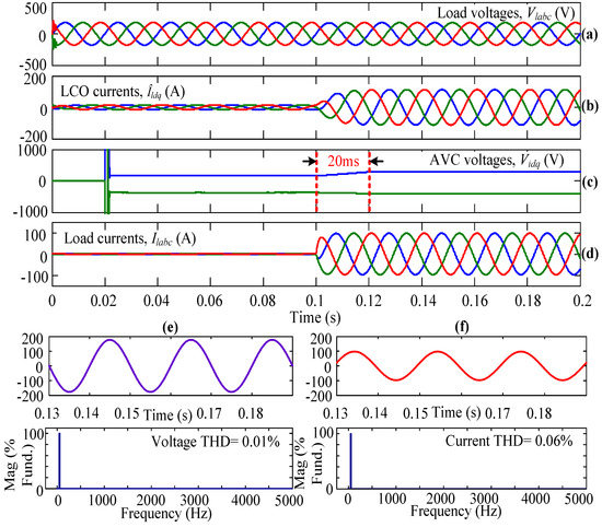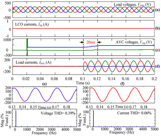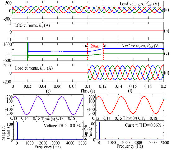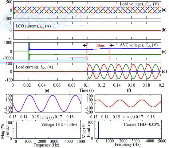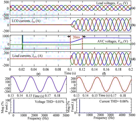 Initially, the system is simulated using AVC only but not the LCO, and the inverter is operated using the conventional SVPWM technique. In Figure 5, Figure 5a represents the three-phase load voltages that are captured after the LC filter but before the circuit breaker. Figure 5b gives the dq-axis currents from the LCO. In this subplot, it can be observed that the dq-axis currents are equal to zero because this case is simulated without LCO. When the three-phase load is connecting to the WECS using the circuit breaker (in other words, when the circuit breaker is closed), the AVC senses the load parameters and takes necessary action, which can be observed from the dq-axis voltages as shown in Figure 5c. From this plot, it can be observed that at t = 0.1 s, the AVC is ready to take the necessary action to obtain a steady-state load current within a few milliseconds. Figure 5d shows the load currents flowing through the three-phase linear load. From the plot, it can be seen that from time t = 0 s to 0.1 s, the load currents are equal to zero because the three-phase circuit breaker is kept open, so no current flows through the load. At t = 0.1 s, the circuit breaker is closed completely (i.e., in all three phases), and the corresponding load currents flow through the connected linear load. From Figure 5c,d, it can be observed that the system is reaching a steady state at t = 0.12 s because of only AVC action. The Vid and Viq or load currents are reaching a steady state within 20 ms. From the results, the THD value of the load voltage and load current under steady-state condition, i.e., from 0.13 s, is obtained as 0.01% and 0.06%, respectively, as shown in Figure 5e,f.