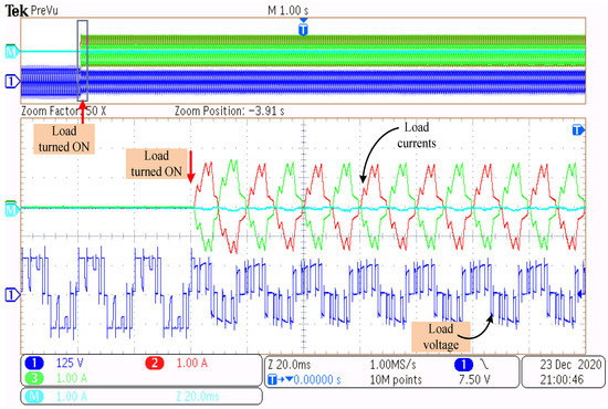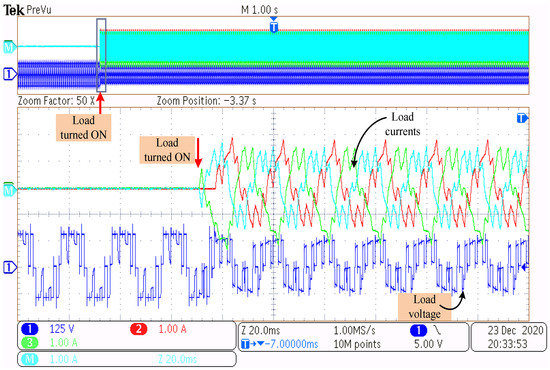 Figure 14 shows the three-phase load currents and the load voltage of one of the phases before the filter. The top plot of Figure 14 contains all the said currents and voltage, whereas the bottom plot is the zoomed view of the currents and voltage. Initially, the DC-bus voltage is applied as 150 V, and the gating pulses are generated by the controller and given to the driver circuits of the inverter without connecting any load. So, the load currents are zero until the load circuit breaker is turned ON; however, the inverter generates voltage, as seen in Figure 14. At the moment when the load circuit breaker is turned ON, the load current flows, as observed in Figure 14. Due to the unavailability of resources (such as inadequate filters) and due to the restrictions imposed (sampling frequency) by the controller, the ripple content in the phase current is very high. This ripple content can be minimized by the proper selection of filter components with respect to the switching frequency (as shown in the simulation results). However, the point of interest of this paper is in the fast transient behavior even under unbalanced load conditions, which is shown in Figure 15 and Figure 16.