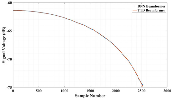 The performance metric for the neural net is the mean square error between the output voltage of a TTD beamformer and the output of the DNN beamformer as shown in (10). A neural network having 10 hidden layers with each layer consisting of 15 neurons is used for the design of DNN beamformer. The value of M i.e., the last layer of DNN is 15 and the value of K i.e., the number of training examples in our case corresponds to 11,775. The activation function for each of the neuron is tan-sigmoid function. The training algorithm uses Fletcher–Powell Conjugate Gradient method [48,49] to minimize the loss function over the training samples as defined in (10). In Figure 3, we show the out-of-sample performance of the proposed DNN beamformer with the output voltage (true) by a TTD beamformer and the output voltage predicted by the DNN beamformer. The sample number denotes samples selected from the generated data set that is reserved for testing. As we can observe, the DNN is able to track the performance as desired with a TTD beamformer at a given AoA with very high accuracy.