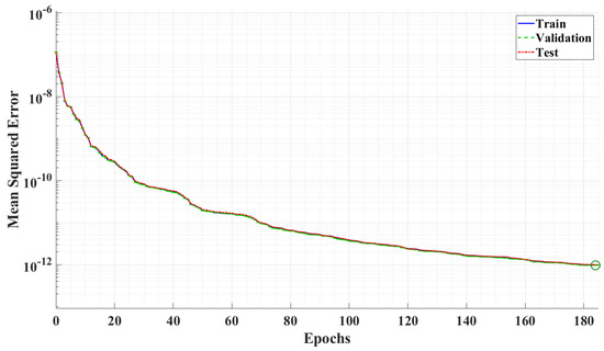 The MSE performance of the implemented DNN beamformer is shown in Figure 4 for the train, test and validation set. We can observe that the mean square (MSE) is very low thus showing that DNN is able to match the performance of a TTD beamformer as the AoA changes at the antenna array receiver. The best performance was obtained in 184 epochs with a very low mean square error as indicated in Figure 4. The MSE performance for the training, test and validation set was observed to be , and respectively. Thus, as we can observe that for a wideband LEO satellite communication system, it is feasible to design a DNN beamformer that will replace the use of costly and non-ideal phase shifters for the beamforming of massive number of antenna array elements. The DNN is able to match the performance as expected by a TTD beamformer for a wideband LEO satellite communication system.