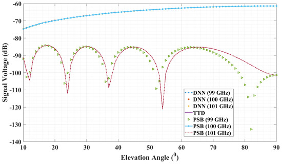 In order to compare and show the performance relative to the phase shifter implementation for a wideband signal, we show the signal voltage of the trained DNN, TTD and PSB beamformer at different frequencies in Figure 5 for the elevation angle in the range of 10–90. The output of TTD is the ideal response that is desired for a wideband signal. It can be observed that for signal frequency of 100 GHz, the PSB also gives exact output as expected by a TTD beamformer but as the signal frequency deviates, the performance degrades severely. As pointed out earlier, this happens as the phase shifter is designed to provide specific delay at a given center frequency and as the frequency deviates, the phase response in not able to provide the constructive interference at the output. The spacing between the antenna elements at the center frequency is taken to be . We note that the trained DNN beamformer is able to match the ideal performance as expected by a TTD beamformer as the elevation angle is varying in the range of 10–90. As for massive number of array elements, the beamwidth of receiver antenna will be narrower and thus the effect of beam-squint can be severe.