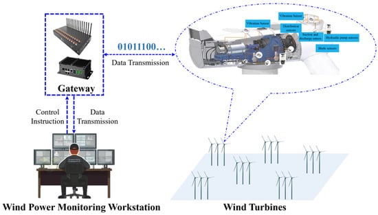 In China, the ninth meeting of the Central Financial and Economic Commission emphasized that carbon peaking and carbon neutrality should be incorporated into the overall layout of an ecological civilization construction. It advocated for a simple, moderate, green, and low-carbon lifestyle and for building a new power system with new energy as the main body [,]. Among them, wind power as a safe, sustainable, and clean form of new energy, has seen a sharp increase in installed capacity and grid-connected ratio in the past two years. To ensure the safe and stable operation of wind turbines, wind-power-monitoring systems are widely deployed in wind farms []. It collects operating information in real time through the wind turbine state sensor (WTSS) and transmits it to the monitoring center remotely through the gateway (GW). Figure 1 shows the information collection and communication process.