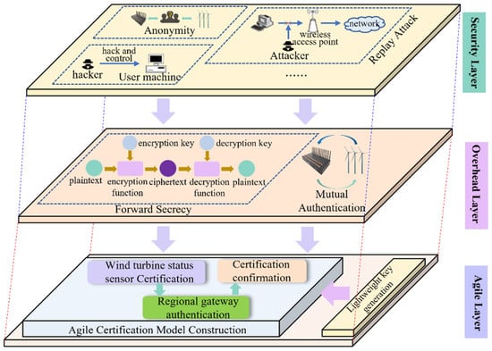 Through the analysis of the authentication process of wind turbine status sensor, the demand analysis is proposed to measure the degree of network attack suffered during the authentication process. As shown in Figure 2, it can be divided into three levels: security, agile, and overhead. The specific target requirements are as follows: