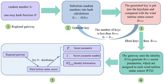 The complexity of the key and verification key determines the security and agility of wind turbine status sensors and gateway authentication. The one-way hash function calculation process is irreversible []. To meet the requirements of fast key generation and secure transmission, this paper uses a one-way hash function to generate keys and iteratively connects the keys to form a key chain. At this stage, it is mainly operated by calculation and storage capabilities than by the gateway of the wind turbine status sensor. The gateway is responsible for the generation and initialization of the hash key chain, wind turbine status sensor identity information, wind turbine status sensor secret parameters, and secret parameter series. The main process of lightweight key generation is shown in Figure 3.
