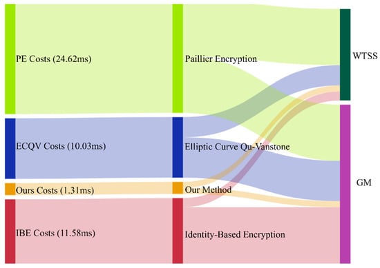 Computational overhead refers to the total computation time spent on the wind turbine status sensor side and the side during the authentication process. Computational overhead is an important indicator of model agility, and shorter computational elapsed time indicates more rapid and agile authentication of wind turbine status sensors. This part compares three typical wind turbine status sensor authentication methods: Paillier encryption (PE), identity-based encryption (IBE), and elliptic curve Qu–Vanstone (ECQV). The experiment tests the time of various calculations in the authentication process in the same environment, and the time-consuming result of the operation is as follows: Montgomery power module operation, , elliptic curve multiplication operation, , one-way hash function operation, , and elliptic point addition operation, , and XOR operation, , can be ignored. The comparison of the computational cost of each algorithm is shown in Figure 5.