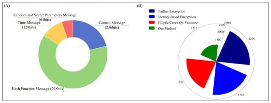 The proposed method transmits information, including , , and . It can be seen from Figure 6A this information can be divided into four parts: one-way hash function information, control information, random number and secret parameter information, and timestamp. Its cost of communication is bits. Figure 6B shows the communication overhead of the four algorithms. The Paillier encryption authentication scheme has the highest communication cost. This is because it uses a large number of transport message authentication codes and additional information for authentication, resulting in a high total cost. The identity-based encryption authentication scheme abandons the transmission of additional information and timestamps and introduces hash keys to reduce communication costs. Elliptic curve Qu-Vanstone authentication scheme communication uses hash function and secret parameter information at the same time to increase security, resulting in a slight rise in communication cost. In general, the communication cost of the method proposed in this paper is significantly reduced.