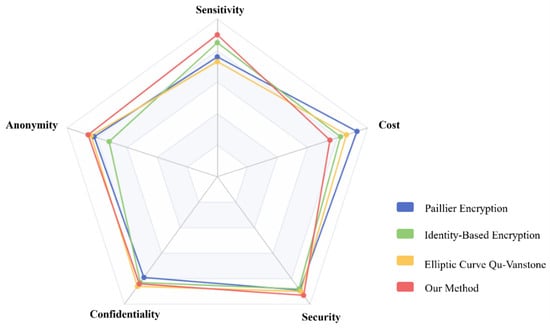 Comprehensive comparative analysis can intuitively watch the performance of the certification scheme in all aspects. This part compares and analyzes the pros and cons of each algorithm from the five comprehensive attributes of sensitivity, anonymity, confidentiality, security, and cost under different method models, as shown in Figure 7.