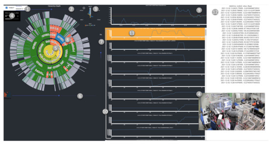 Overview over the Flourish dashboard. The Flourish dashboard is split into three main sections (the Flourish visualization, the context OD model view, and the log view) that expand on selection. The anchor of the dashboard is the Flourish visualization (5). Figure 6 shows the elements visible at the start. The dashboard consists of a checkbox to enable the live video feed and a dropdown list to select a previous recording (1). The dropdown list to select a previous recording is present for the prototype evaluation only since in a live system, the production line will constantly be recorded. The hierarchy-depth slider (2) refers to the displayed context hierarchy in the Flourish visualization and enables adjustment of the displayed depth of the context hierarchy. The spider diagram (3) displays the developed AI evaluation metrics for unsupervised-trained ensembles. The live video feed (4) of the current situation is synchronized with the rest of the dashboard, respective to the data. An adjustment of the time slider (6) would also lead to an adjustment of the in Flourish displayed information and the time slider of the video. The threshold slider (7) adjusts the thresholds of all employed context OD models by the percentage that affects the Flourish visualization and the displayed model performance (9) after a context OD model is selected (8). Additionally, the model performance displays both used thresholds that distinguish between medium (yellow) and serious errors (red); both are affected by the threshold slider (6). The context window (10) is displayed under the model performance and visualizes the numerical transformed data that are fed to the context OD model to evaluate the current point in time (vertical green line in model performance). After some anomaly is spotted by the professional, the selection of a graph with numerical transformed values (11) opens the log view (12) and displays the back-transformed original log values. For better readability, the node id and the datatype are hidden.