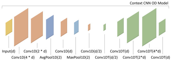 Neural network configuration of a context OD model. The context OD model is a convolutional autoencoder neural network. Different layer types are colored differently. The first layer will enlarge the input dimension d with filters by a factor of 4. Furthermore, the descending layers will reduce the size by a factor of 2 down to . All convolutional layers, including the transpose layers T, use a kernel size of three with a stride of one and keep the input-output dimension the same with padding (not drawn in the figure). The pooling layers’ pool size is two with no strides. All convolutional layers use the tangens hyperbolicus (tanh) as an activation function, besides the last layer, where a linear activation function is in place. The kernel initializer is the Glorot uniform algorithm, and the bias is initialized with zeros in all convolutional layers.