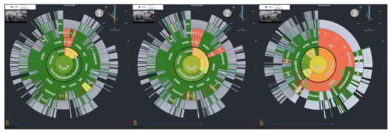 The Flourish visualization has a radial design that originates on a sunburst chart. Besides that, work exists that shares similarities with the Flourish visualization. For instance, Keim et al. [15] developed CircleView to visualize multivariate streaming data. Here, variables are placed on segmented circles reflecting periods of time. Despite the segmentation, Flourish visualizes the current situation without displaying values over time. Krzywinski et al. [16] published Circos, a multivariate display to differentiate genomes. Here, the center holds information, which is detailed in circles around the center. The Flourish visualization adapts this style of information aggregation in the center but uses a blossom to provide the status of the production line context and CPS contexts. Bale et al. [17] proposed Kaleidomaps. Like Kaleidomaps, the Flourish visualization highlights certain areas of interest and pinpoint the professional in a certain direction and provide remarkable patterns if the professional scroll through time. Tominski et al. [18], with the enhanced spiral view, and Weber et al., with the spiral graph [19], gave examples of a radial information flow, from the outer to the inner. Likewise, the Flourish visualization adapts that kind of information flow to achieve some similar attention highlighting with the focus on the current situation rather than giving a comparison between time spans. KronoMiner, published by Zhao et al. [20], is also a great example of a radial layout, where information is more aggregated toward the center. In the center, aggregated information can be selected in a circle, which expands into another layer, where now additional information is shown because of the space available. The Flourish visualization reacts similarly, where higher-level contexts also aggregate the information of the underlying contexts. The contexts also have sub-contexts and go from overview to more detailed contexts. In contrast to sharing the hierarchical order with KronoMiner, the Flourish visualization displays the results of distinct models and aggregates the current situation toward the center. A similar example is the SolarPlot published by Chuah et al. [21]. The solar plot with the aggregate tree map is used to display the hierarchy of a company from the top layer of management to the employees (outer layers). The chosen segments are the departments of the company. The Flourish visualization is similar; toward the center are the more high-level contexts, whereas on the outer layers are the more fine-grained contexts. Additionally, the segmentation is comparable between departments in the solar plots and the stations employed in a production line. Additionally, the Flourish visualization is inspired by nature. To the best of our knowledge, a similar visualization with similar functionalities for a comparable purpose does not exist at the moment.