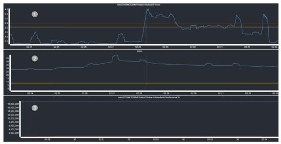 All techniques work unsupervised, from type-based transformations to unsupervised dimensionality-based convolutional autoencoders with automatically set thresholds based on a second ground truth dataset. The Flourish dashboard should enable the professional to judge the current situation but also to evaluate the current system behavior and the classification. As a side effect of the unsupervised process, there are always models in which training is not sufficient. Therefore, an error baseline within the autonomous system exists because the insufficiently trained neural networks will report false positives. Consequently, the professional who works with the system has to determine the error baseline. In the prototypical implementation, the professional can determine the error baseline during a time-based walk through the dataset. The production line context error rate will keep in a certain range, and exceeding will hint toward a fault that is worth exploring (Figure 3). The error baseline depends heavily on the surveyed production line and the employed models. After a suspicious situation is spotted by the professional, the professional can dive into the highlighted situation. After a click on one of the context models, the context OD model view is shown (Figure 1, No. 9–10). After the selection, the professional has to evaluate the model’s performance (9). Figure 4 presents the three types of model performances: good, bad and non-functional. The model performance is rated as good if the model remains under the set threshold most of the time and only excels if something unusual happens (1). A sign of a working model is that the values fall under the threshold again after a short period. In order to enable the professional to judge the model, a longer period is displayed in the model performance (in the shown case, around 10 min). Insufficiently trained models can be distinguished, as their reconstruction error is mostly over the set threshold and has some spikes (2). Here, the threshold slider can be used to adjust the former to see if the spikes are within the range. Non-functional models will return values that, regardless of what is fed to the neural network, highly exceed the threshold (3). Consequently, no reasonable judgment can be made if the values relate to a fault. If a good model is traced, the professional can use the context OD model view (10) to detect something suspicious. In Figure 1 the professional selected the suspicious graph (Figure 1, 11) that describes the press arm position. Here, the press arm hits multiple times, hinting toward a missing relay. In the log view (Figure 1, 12) the real log values confirm the suspicion. The professional may use the live video feed to detect suspicious behavior and see the missing relay for extra validation.