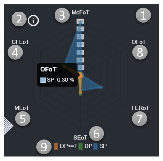 An additional information canal for the professional is the AI performance metrics for unsupervised ensembles (Figure 5). In a highly complex Industry 4.0 setting, labeling data is a tedious and time-consuming task. For this reason, the Flourish dashboard and back-end are fully unsupervised. Consequently, no labeled data exist that can be used to calculate standard measures, such as accuracy, precision, and -score to measure the performance of the employed neural network models. Furthermore, the factory environment forms a streaming environment where data are always generated. AI performance metrics target both challenges for unsupervised ensembles. The unsupervised system with all its context OD models can be seen as a joint ensemble with multiple models, where the professional evaluates the ensemble rather than a function. In this publication, we propose a novel set of metrics that lead to a comparability of the employed system rather than calculating the correctness. The general idea is that those non-functional models are distinguishable. We define a non-functional model as a model in which the threshold t is exceeded by an unreasonable factor n. In our prototype, we set this barrier to . Therefore, every model that exceeds the 100-times threshold (>100) is considered non-functional. Next, this border can be used to classify a model as non-functional, but the border can also be used on an observation basis. Each context window that is fed to the neural network for classification is also an observation. Now, each situation to a time T can now be fed to x-context OD models, which will evaluate x-context windows, respectively x observations. This can be performed for all points in time T in a dataset to obtain the dataset performance and over all datasets to retrieve the system performance . Figure 5 shows the visualization of the AI performance metrics for unsupervised ensembles. The metrics are presented in a spider diagram (1). An explanation of the metrics is shown on mouse over (2).