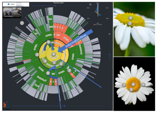 The Flourish visualization in detail. The Flourish visualization is inspired by nature, Bellis Perennis, alias the daisy flower (top right (https://www.pexels.com/photo/white-daisy-flower-612331/, Pexel License, Hilary Halliwell, 2017, accessed on 2 August 2022) and bottom right (https://www.pexels.com/photo/white-and-yellow-daisy-flower-close-up-photography-45901/, CC0, Pixabay, 2016, accessed on 2 August 2022)). Moreover, the Flourish visualization is a sunburst visualization that inherits custom logic to tie the contexts, the context hierarchy (1), and the production line together. The blossom of the Flourish visualization (2) is a centralized segregated information aggregation. In the outer ring of the blossom (3), the CPS contexts are placed, which aggregate the classified information of the sub-contexts. Furthermore, the center of the blossom (4) reflects the production line context, which aggregates the information of all context OD models and displays the current error percentage of the classified situation. The petals (5) are the CPS-related sections that comprise the CPS context (6) and the sub-contexts (7). Thereby, the information flow is always towards the center, as depicted. All sub-contexts that an OD model backs are aggregated (8) and form the CPS context. All CPS contexts are aggregated toward the center (9). The blossom has the functionality of a traffic light and describes the status of the production line. Each context that an OD model backs is colored; otherwise, it is gray. For that reason, the contexts are visualized distinctively, and a classified error will not change the color of the superior levels but will affect the CPS information aggregation. Employed colors are yellow (exceeding the first threshold), red (also exceeding the second threshold), purple (exceeding the set non-functional boundary), and gray (no OD model present). While the contexts have binary coloring, the information aggregation has a linear scaled color scheme between green, yellow and red.