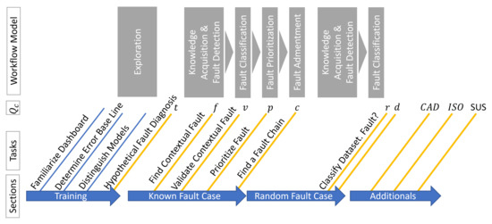 The evaluation of the Flourish dashboard prototype is based on a workflow model developed in our previous publications [1,2,44]. We describe the tasks for diagnosis that an analyst has to perform within the SF [1,2] (SF shown in Figure 7). We state the four tasks: exploration, knowledge acquisition, analysis, and reasoning. Later, we define the fault-handling process in Industry 4.0 [44]. Figure 8 depicts the relation of both publications, the workflow model, and the evaluation. We employ our workflow model to align the evaluation, the tasks, and the sub-sections of the questionnaire (Figure 9). The study is oriented around the presented workflow model. Each fault diagnosis process begins with knowledge acquisition or exploration, followed by fault detection, fault classification, fault prioritization, and finally, fault amendment. The evaluation starts with fault detection and goes over the classification to end with fault chain detection to narrow down the fault’s origin. Each section is segmented into multiple tasks. After finishing a task, a questionnaire section must be answered. In this section, we present the environment (Section 4.1), the user groups (Section 4.2), contextual faults and the recorded data (Section 4.3), the structure of the study (Section 4.4), and state the results (Section 4.5).