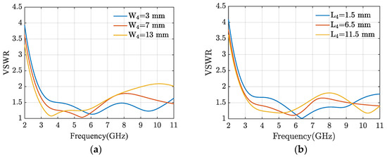 Simulated VSWR of the proposed antenna under different values of corner cut (a) W4 (b) L4.