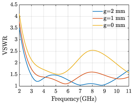 The antenna and the ground can be equivalent to a dipole antenna [19]. Making the appropriate size cutouts on both ends of the ground plane can affect the electromagnetic coupling between the circular patch and the ground plane, greatly enhancing the impedance bandwidth [20]. W4 and L4 of the ground corner cut are analyzed in Figure 2. When W4 and L4 are larger, the low-frequency performance of the antenna is better. When W4 = 13 mm, the VSWR of the antenna at 9 GHz exceeds 2, and the UWB function cannot be realized. When L4 = 11.5 mm, the VSWR of the antenna oscillates in the high-frequency band. The distance between the radiating patch and the ground plane is marked as g, which is an essential factor affecting the impedance bandwidth of the antenna. Figure 3 shows the frequency characteristic curve of the VSWR of the antenna as a function of the parameter g. When g is changed from 0 mm to 2 mm, the bandwidth of the antenna displays a widening trend. When g = 0 mm, the VSWR of the antenna cannot meet the requirements of UWB. When g = 1 mm and g = 2 mm, the antennas are well matched in the UWB band. This result only corresponds to the numerical change of g, while the other size parameters of the antenna remain unchanged.