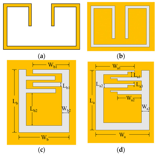 The geometry of band-notched structures: (a) curled split-ring resonator, (b) curled C-shaped slot, (c) interdigital inductance slots 1, and (d) interdigital inductance slots 2.