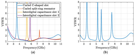 Simulated VSWR of the proposed antenna under different structures. (a) Curled C-shaped slots. (b) Interdigital inductance slot.