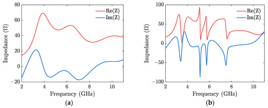 Figure 6a gives the impedance curve of the UWB antenna without the notch-band structures. The real part of the impedance is around 50 Ω and the imaginary part is around 0 Ω. The impedance curve of the UWB antenna with notch-band structures is given in Figure 6b. At 3.5 GHz, 5.2 GHz, 5.8 GHz, and 7.6 GHz, the real part of the impedance is approximately zero and the slope of the imaginary part is positive, showing series resonance characteristics. A low impedance at the feed point results in a mismatch and a band-notch characteristic is observed.
