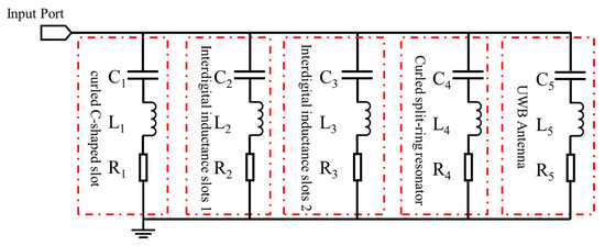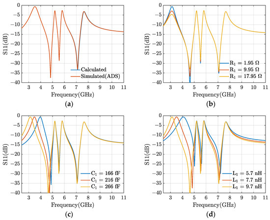 Figure 7 shows the equivalent circuit model of the proposed antenna. According to Figure 7, S11 of the equivalent circuit model can be obtained from the Equations (6)–(8). Figure 8a shows the S11 curve of the circuit model obtained through ADS simulation, which agrees with the S11 parameters calculated by the formula. The circuit parameters are analyzed. Taking the curled C-ring as an example, Figure 8b illustrates that when L1 and C1 are unchanged, the notch frequency and band-stop width of the antenna do not change. Figure 8b shows that both R1 and L1 remain unchanged; the notch-band frequency decreases with the increase of C1. Figure 8d depicts that when R1 and C1 remain unchanged, the frequency of the notch band and notch width decrease with the increase of L1. From the above rule, it can be concluded that when the notch frequency needs to be changed, only the capacitance of the structure needs to be changed. When the notch width needs to be changed, it is necessary to change the L of the structure first to obtain a suitable notch width, then change C to move the notch to the appropriate frequency.