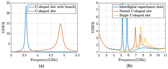 As shown in Figure 9a, compared with the C-shaped slot without branches, the slot with branches has a lower frequency, narrower notch bandwidth characteristics, and higher VSWR, which helps filter narrow-band signals. In Figure 9b, the ground plane loaded with single C-shaped slots, nested C-shaped slots, and interdigital inductance slots is compared when those slots occupy the same area. Two narrow-band WLAN frequencies can be accurately filtered out by interdigital inductance slots and retain the valuable frequencies, and it is also more compact.