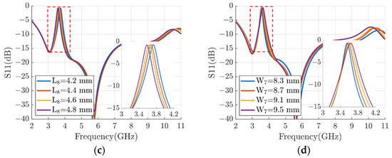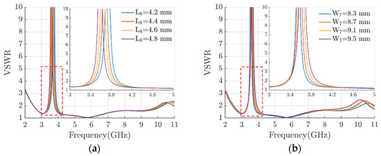 To further study the feature of the band-notched antenna, several parameters of the band-stop structures are investigated in Figure 10. When the L8 is changed from 4.2 mm to 4.8 mm, the band-stop frequency will shift to the low frequency due to the longer electrical length. When W7 changes from 7.5 mm to 9.5 mm, the rising edge of VSWR hardly changes, and the falling edge shifts, which leads to the notch bandwidth increasing from 0.38 GHz to 0.56 GHz. The distance of the curled C-shaped slot’s tail branches controls the band-stop’s width but has little effect on the rising edge of VSWR. From the analysis in Figure 10c,d, and Section 2.3, the essence of increasing L8 is to increase the equivalent capacitance of curled C-shaped slot. The essence of increasing L7 is to reduce the structure’s equivalent inductance and increase the structure’s equivalent capacitance. By choosing the length and distance of tail branches of the slot correctly, the band-notched feature can be controlled efficiently.