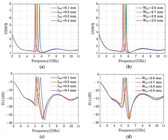 The length and width of the interdigital inductance slots at the interdigital position are analyzed in Figure 10. When the interdigital width Lb1 ranges from 0.1 to 0.4 mm, the center frequency of the band-stop and the band-stop width has significantly changed. When the interdigital length Wb1 is from 2.6 to 2.9 mm, the band-stop frequency and band-stop width also change, but the change is small. From the analysis in Figure 11c,d, and Section 2.3, increasing Lb1 reduces the equivalent capacitance of the interdigital inductance slot. The essence of increasing Wb1 is to reduce the equivalent capacitance of the structure. The band-stop parameter can be controlled by modifying these two parameters simultaneously, or the two parameters can be combined to form a stepped interdigital inductance slot, such as the structure in Figure 4d. Using interdigital inductance slots and the added tail branch in the general C-shaped structure makes it possible to filter out the interference frequency band more accurately and achieve high selectivity of the notch.