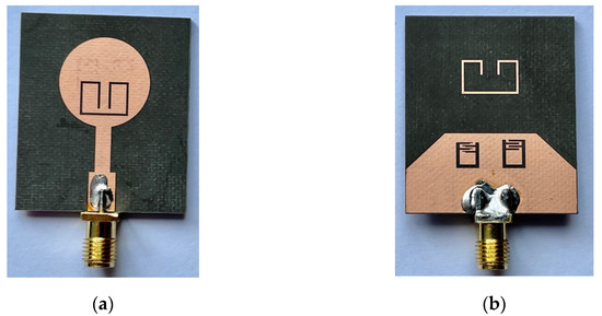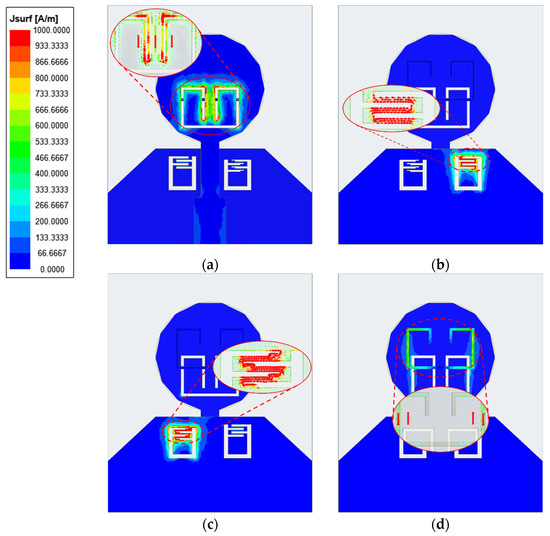 Figure 12b,c show the antenna’s surface current distribution for the two frequency bands used by WLAN. When the antenna works at 5.2 GHz and 5.8 GHz, most of the current is concentrated at the interdigital resonant structure of the interdigital resonant slots. The structure resonates around 5.2 GHz and 5.8 GHz, and the energy cannot be radiated effectively, so a band stop is formed. Figure 12a,d show the surface current distribution of the antenna working at 3.5 GHz and 7.6 GHz. For 3.5 GHz, the current directions are opposite along the inside and outside of slot (a), and the currents are canceled by each other, so the antenna does not radiate, the surface current is concentrated in the curled C-shaped slot, and a frequency notch is achieved around the 3.5 GHz [23]. When the antenna works at 7.6 GHz, the current direction generated by the curled split-ring resonant on the backside of the antenna is opposite to the current direction generated by the corresponding position on the front side of the antenna. Thus, the currents in opposite directions cancel each other out, causing energy to be stored in the curled split-ring resonator rather than radiated into the air.