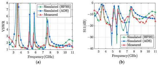 Figure 14 shows the simulated and measured VSWR and S11 of the designed antenna. The green line is the data obtained from the antenna simulation using HFSS, the blue line is the data obtained from the antenna equivalent circuit model simulation using ADS, and the red line is the measured data. It can be observed that the center frequency of the notch in the actual measurement has a certain frequency offset, which may be caused by the tolerance generated during manufacture and the welding of the antenna connector. The measurement shows that the antenna can achieve frequency coverage of 2.9–11 GHz and produce four band rejections of 3.38–3.75 GHz, 5.01–5.25 GHz, 5.63–5.86 GHz, and 7.45–7.82 GHz.