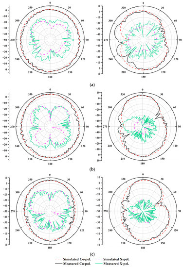 Simulated and measured radiation patterns. X-Z Plane (left) and Y-Z Plane (right). (a) 6 GHz, (b) 8 GHz, and (c) 10 GHz.
