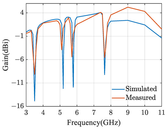 In addition, the gain of the antenna is given in Figure 16. The antenna’s gain decreases rapidly in the notch band frequency, reaching minimum points at 3.5 GHz, 5.1 GHz, 5.7 GHz, and 7.63 GHz, respectively. Furthermore, the antenna’s maximum gain reaches more than 4 dBi, which proves that the antenna realizes the quadruple band stops.