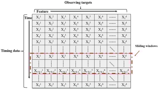 A multivariable time series is composed of multiple univariate time series containing dependencies between multiple features. The time series is usually observed under continuous equidistant timestamps, where the input multivariable time series data are , , T is the maximum length of the input timestamp, d is the number of variables for each timestamp, and . See Figure 1.