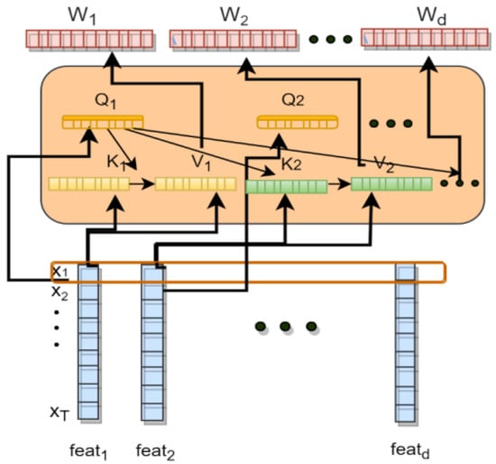 where is the weight between the current feature and other features. We obtain the relationship between each feature in each input timestamp. denotes the softmax activation function; and , respectively, represent the key vector and query vector representation obtained after the current feature is multiplied by its key matrix and query matrix .