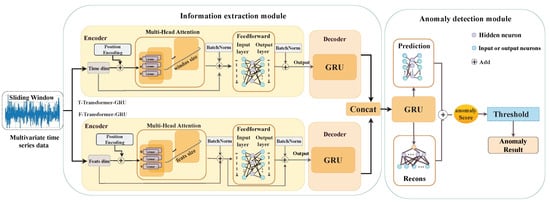 Encoder: The transformer relies on the attention mechanism to catch the relationship between contexts well and can preferably model sequence data. The training speed of the model is improved by this method. In this part, the structure of the transformer is enhanced and applied to anomaly detection tasks on multivariable time series. As shown in Figure 3, the T-transformer GRU and F-transformer GRU capture the time correlation and feature correlation of multivariate time series data, respectively. Through the multi-head attention mechanism, it obtains the relationship between each feature and the long-distance time hiding information between time series data. Next is the formula explanation of this part. Firstly, the established three matrices, , , and , are denoted as query matrix Q, key matrix K, and value matrix V, respectively. The calculation formula for self-attention is